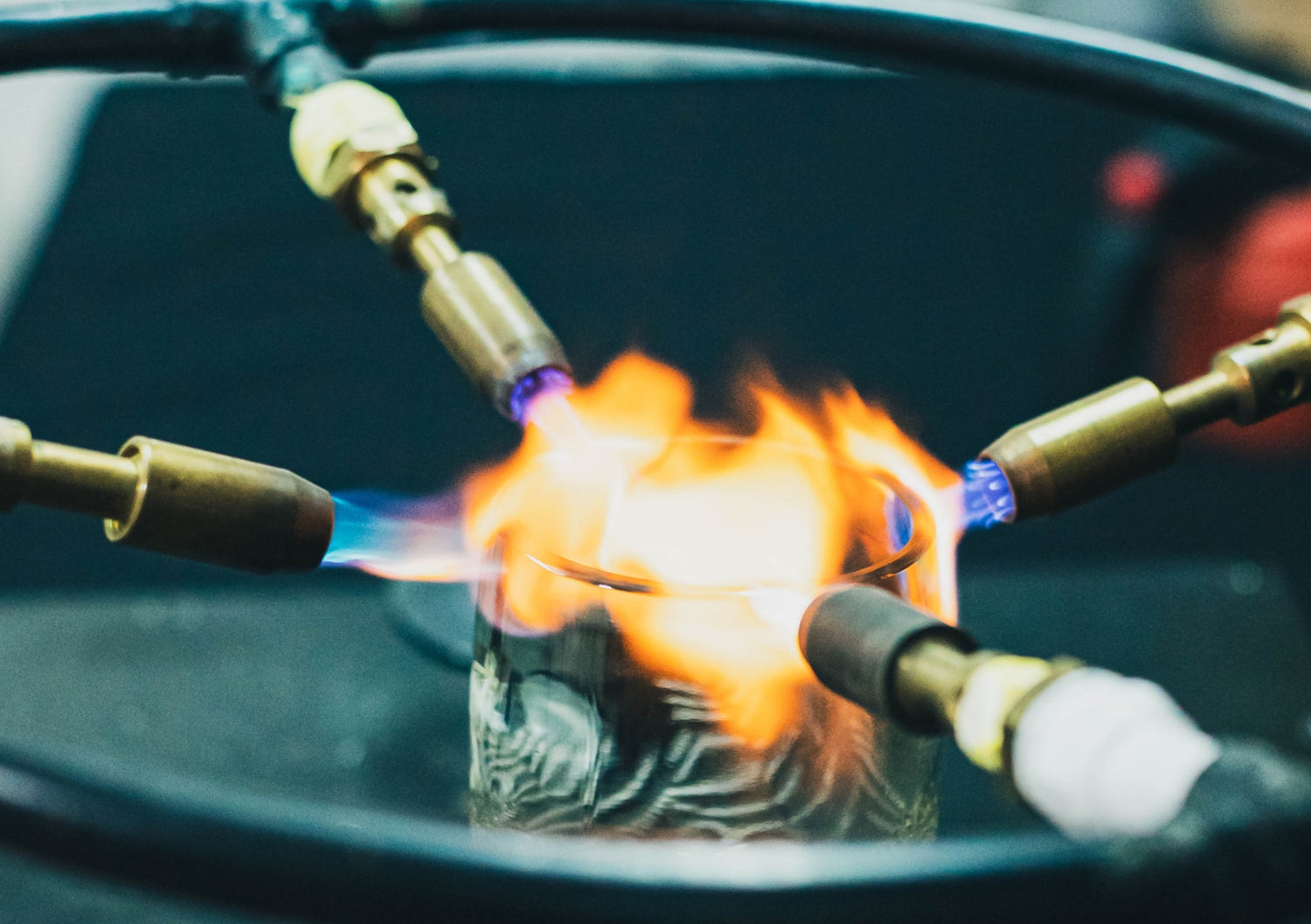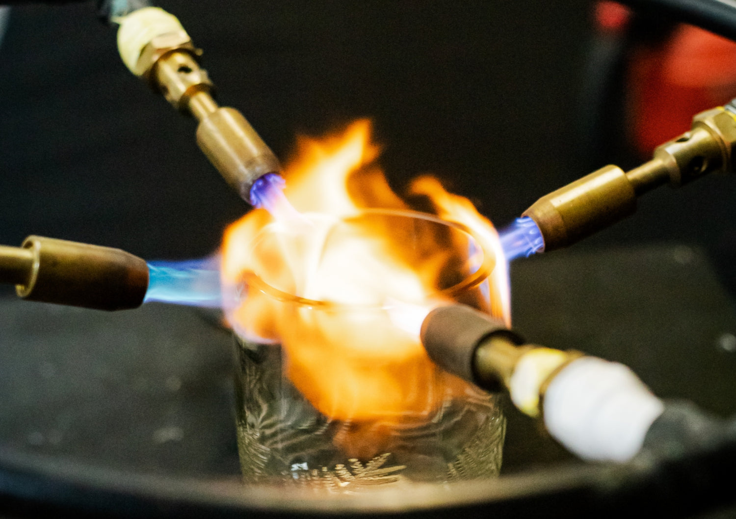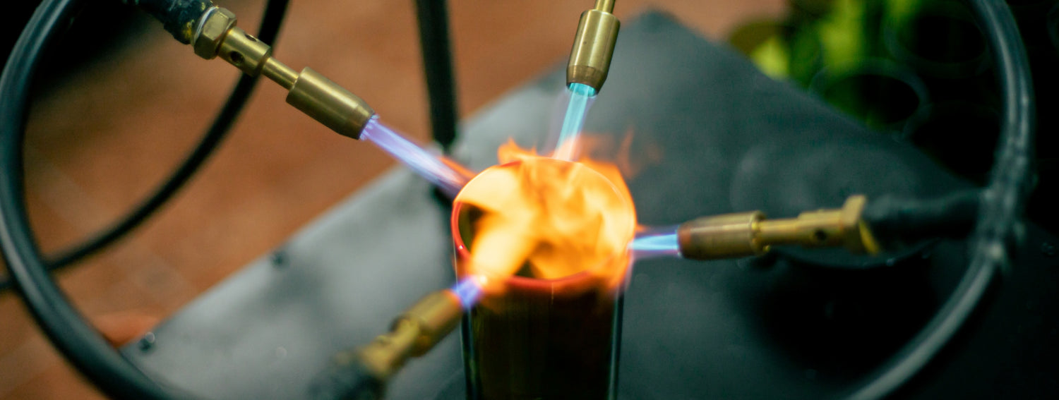 Cuando el vaso ya está lavado y completamente seco, interviene nuevamente el mágico fuego, el cual a través de sopletes quema (a veces derrite) el borde de nuestros vasos, haciendo que éstos queden totalmente suaves y pulidos, libres de cualquier polvillo de vidrio perjudicial para la salud