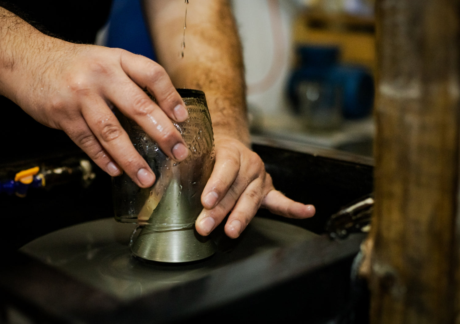 Nuestro proceso cuenta de 4 etapas de pulido 😱, la primera parte le quita el filo, la segunda le quita el filo interior y la tercera parte se realiza en el exterior y borde del vaso, finalmente volvemos a lijar con un disco más fino para que quede un vaso con borde totalmente suave.