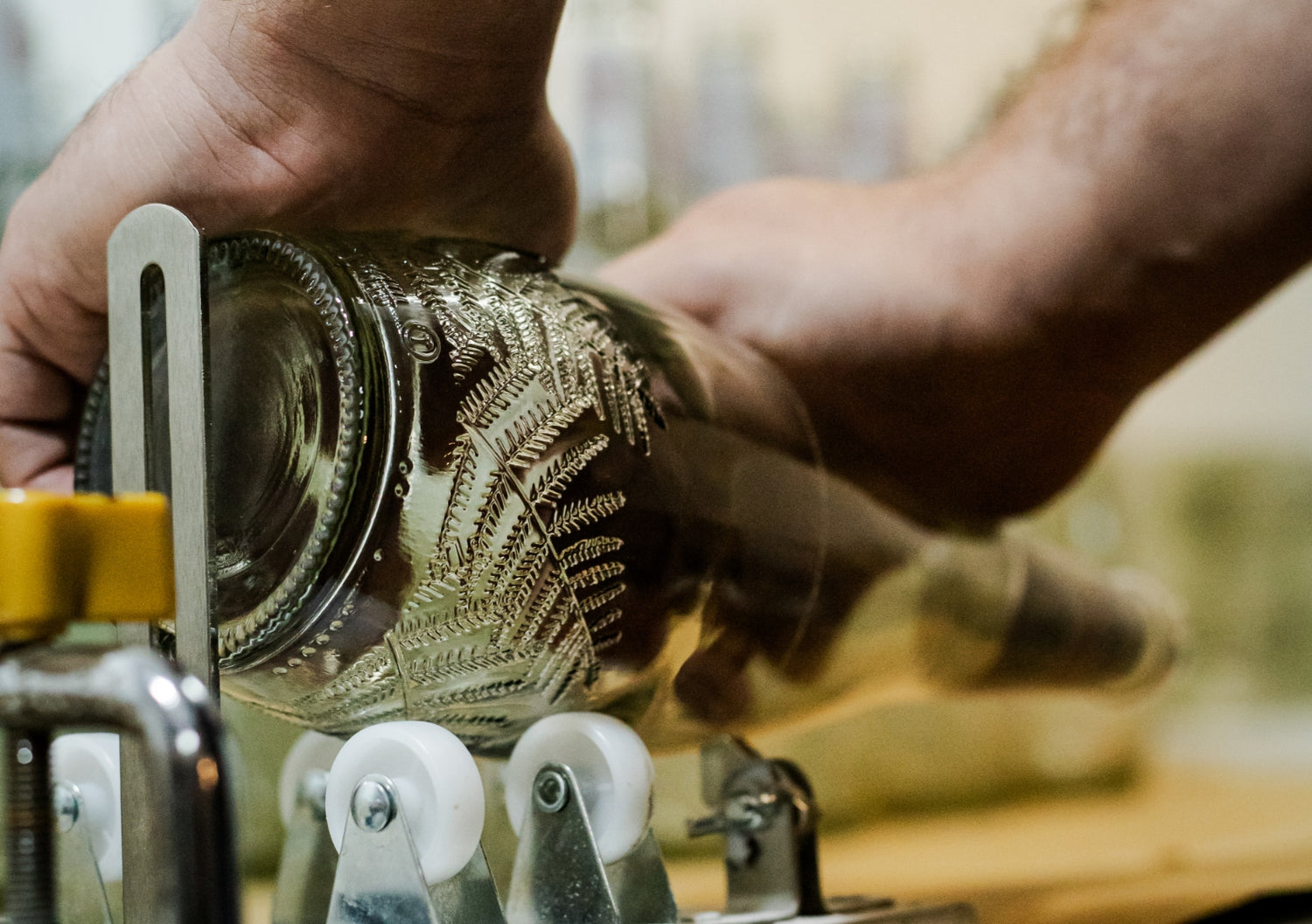 Con un diamante o "maquina cortadora de botellas" marcamos la botella de vidrio a la altura que queremos realizar el corte, es importante no hacer mucha presión para que ésta no se rompa.