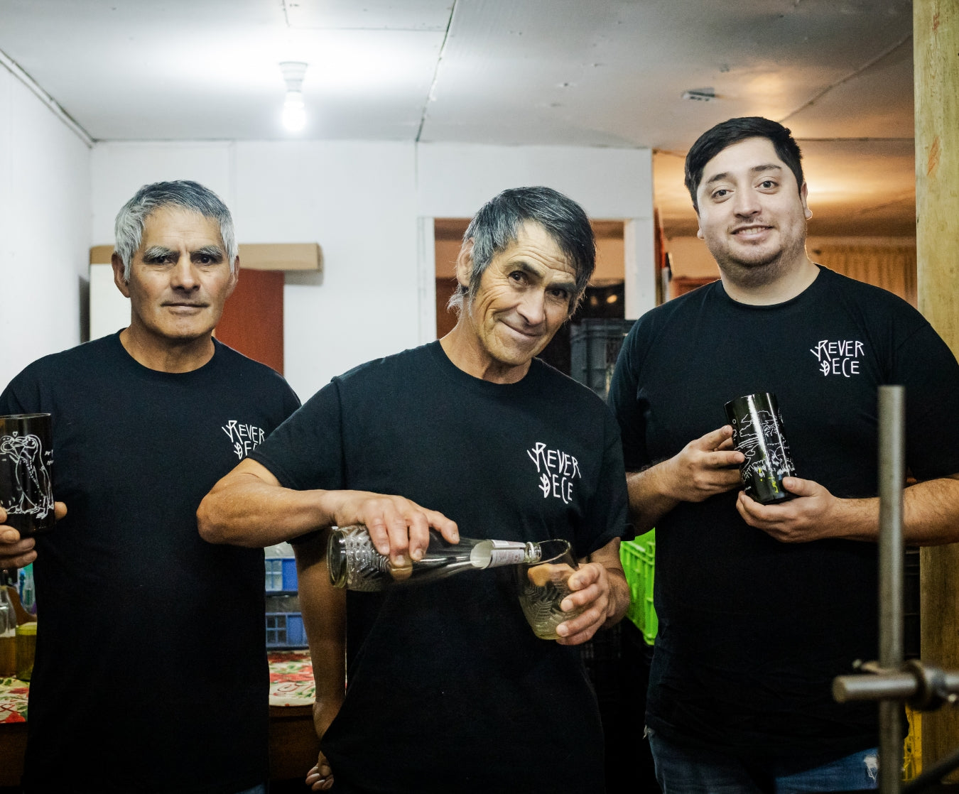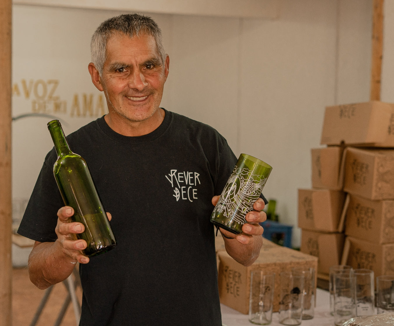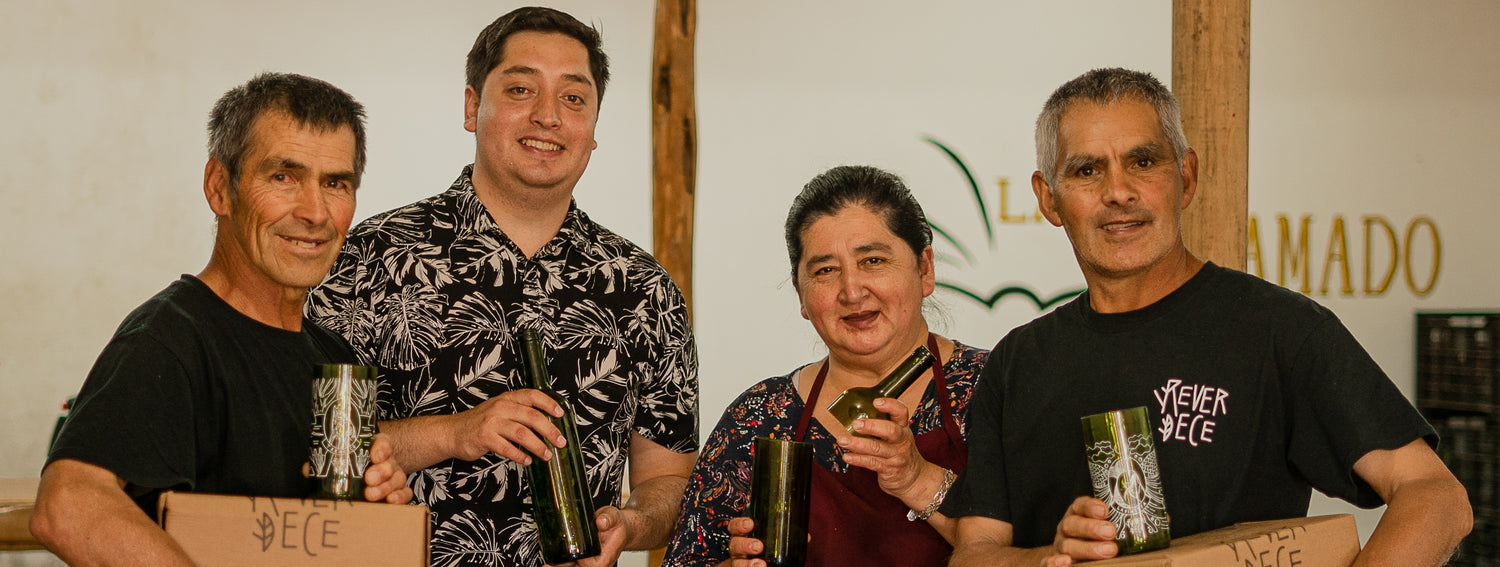 Cada vaso es realizado en familia, don Juve recolecta las botellas, la señora Cata y don Waldemar las lavan y Jonathan, corta, lija y pule los vasos que llegan a tus manos